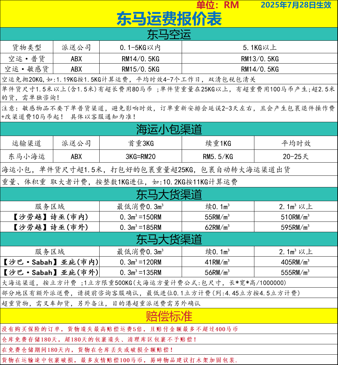 * 默认体积重与实重比较,取较重者计算运费,免抛/半抛优惠请参考报价说明。